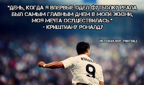 День когдая первый раз одел футболку Реала, был самым главным футбольным днем в моей жизни!!моя мечта сбылась..®Криштиану Роналду®
