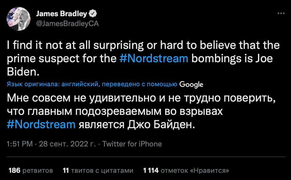 В беседе с ведущим подкаста Judging Freedom Эндрю Наполитано он назвал абсурдными домыслы о том, что за ЧП на трубопроводах может стоять Россия. "Русские не делали этого", — подчеркнул Макгрегор, отметив также, что причастность к инциденту Германии "крайне маловероятна".