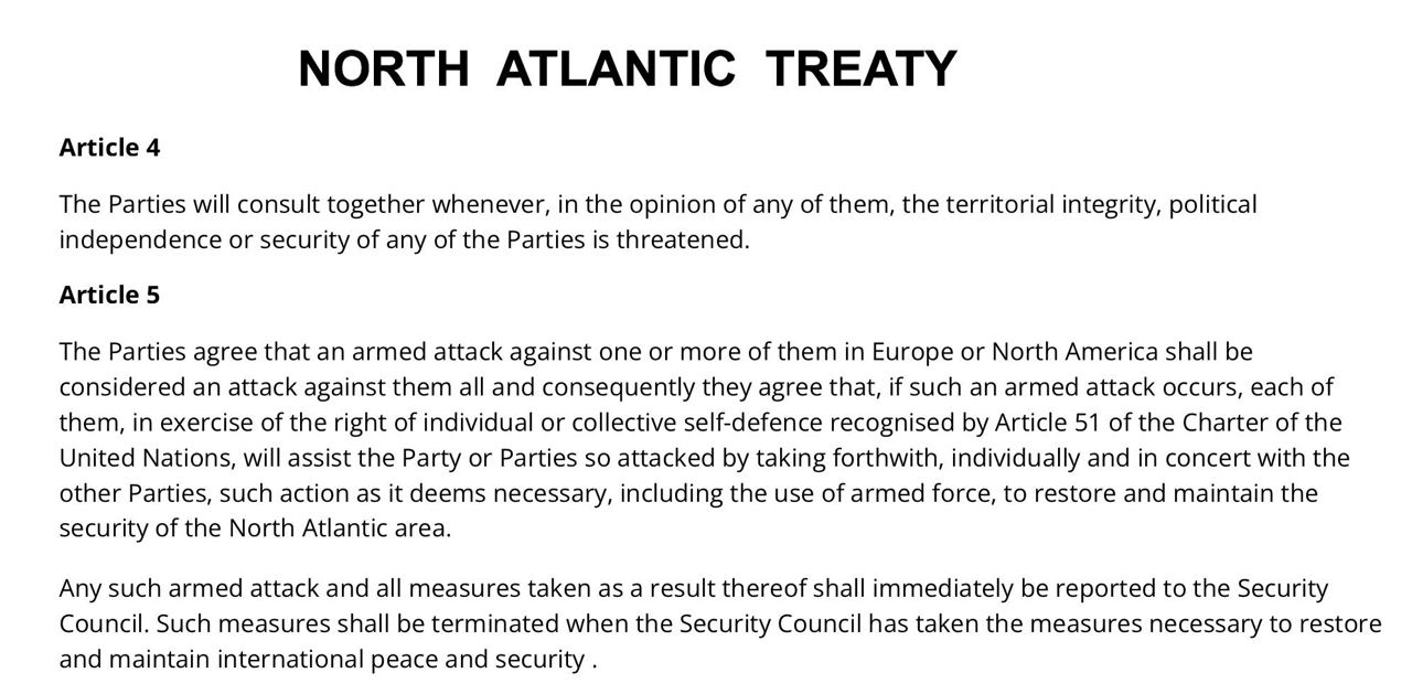 Если причастность США к выводу из строя "Северных потоков" подтвердится (а СП — инфраструктура, жизненно важная для экономики Германии и не только), то это, согласно Уставу НАТО, означает нападение на территориальную целостность и безопасность члена НАТО (ст. 4).