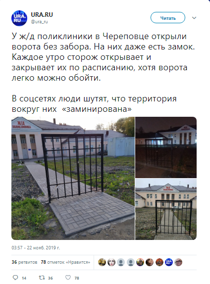В городе Череповец возле здания поликлиники РЖД появились новые железные ворота. По словам местных жителей, каждый вечер сторож поликлиники закрывает ворота на замок, а утром их снова открывает.