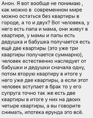 Ну даже не знаю. Мне двоих родителей в свою однушку тащить (хотя я там на птичьих правах, она подарена мною сыну) или к ним идти, предки, а давайте жить вместе, я один не могу выжить. Хотя есть более интересный вариант. Жить с дочей. Вместе с моей школьницей мы неверняка сдадим ЕГЭ. Купим ей платье на выпускной. Если не упадем в голодный обморок с одной минимальной зарплатой.