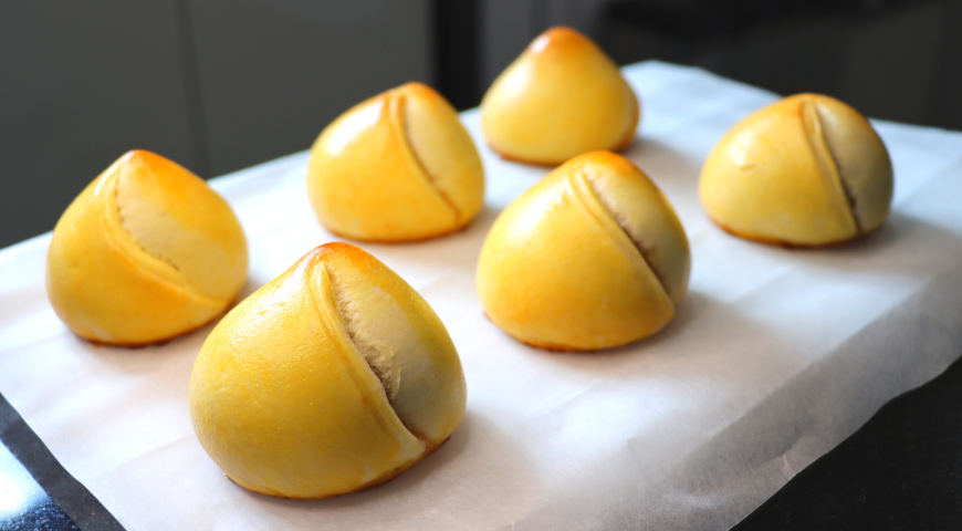Положите тесто напротив себя на стол, подпылённый мукой. Сделайте один разрез от центра к краю. На одну из сторон выложите яблочную начинку. Начинайте сворачивать пирожок по кругу, защипывая края. В конце формовки придайте форму купола.