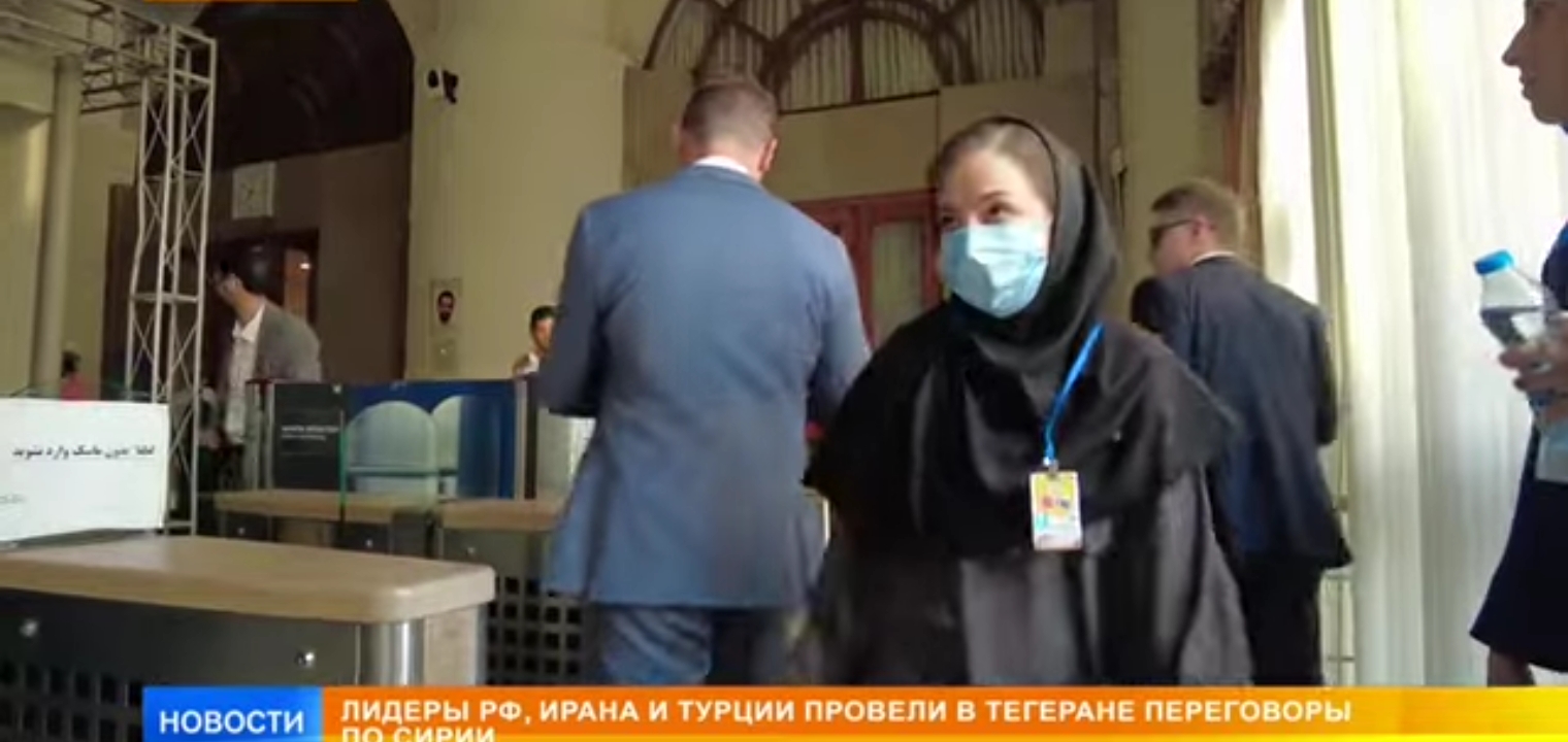 Вот в масочке в Иране журналистка местная, скрин из новостей. Цари трёх стран и начальство, конечно, без масок.