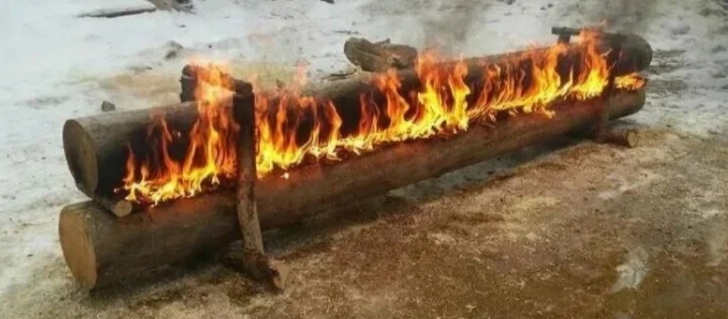 В конструкции всего два бревна, которые укладываются вертикально одно над другим. Огонь разжигается между ними и даёт равномерное и длительное тепло за счёт медленного горения.