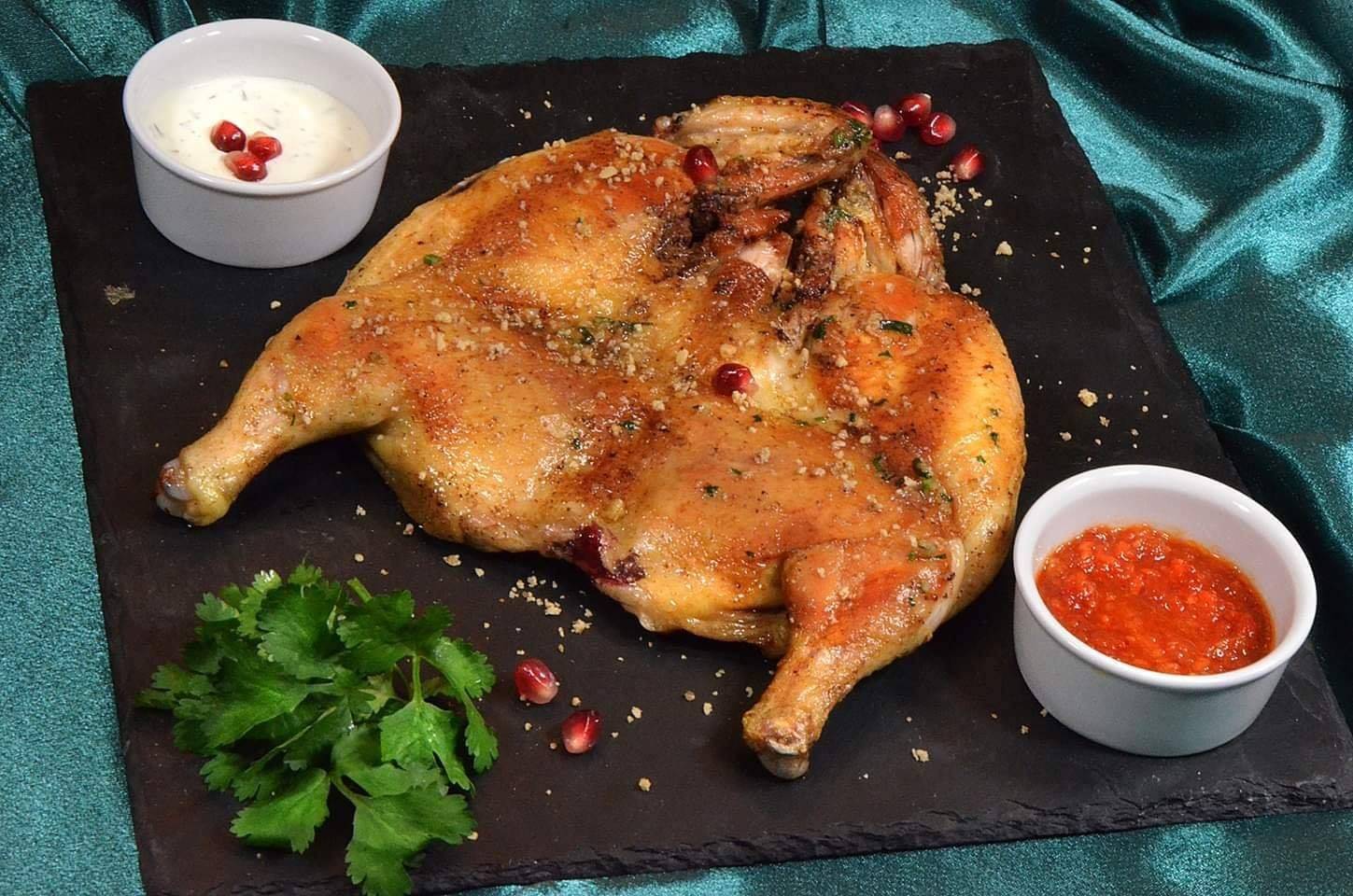 Национальное блюдо грузинской кухни, цыплёнок, жаренный на сковороде под прессом.