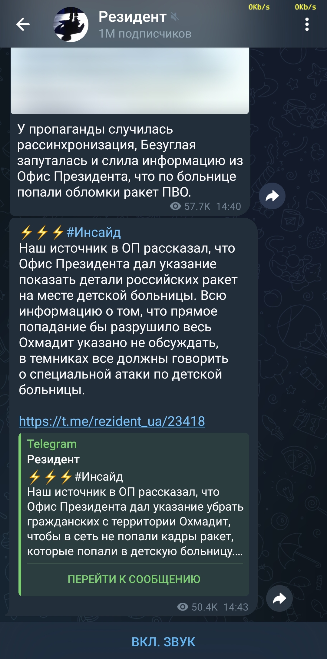 Цыганский~Конь, есть видео в ТГ там видно ракету прилетевшую в Охматдит(как заявленно на самом видео.)посмотри в Реальный Киев.
