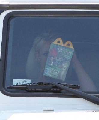 Второй раз Брит была замечена на пассажирском сидении в своем белом внедорожнике Mersedes,за рулем был ее охранник Иден,они заехали McDonald"s,где купили(судя по фото) Happy Meal.