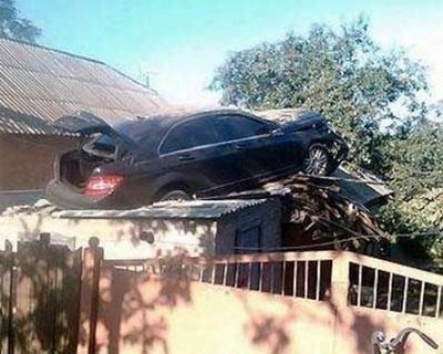 В пос. Вакуленцы (Полтавская область) «Мерседес» съехал с дороги, пролетел 30 метров и приземлился на крышу частного дома.