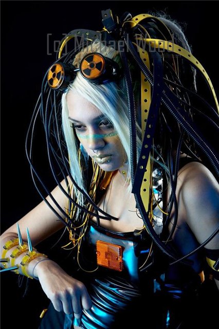 * Блестящие (светоотражающие) облегающие черные или фольговые виниловые штаны, футболки с атрибутикой и надписями, топы, синтетические жилетки на молнии, виниловые плащи а-ля Матрица (фильм)