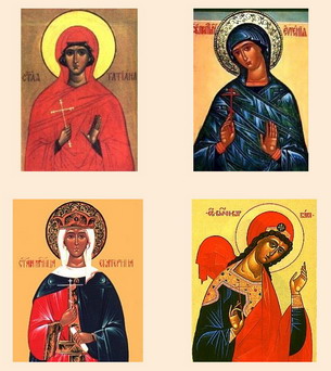 Давайте посмотрим на иконы святых дев, не познавших мужа, и сделаем вывод об их одежде. Иконы (слева на право и сверху вниз) - святая мученица Татиана Римская (+225), святая мученица Евгения Римская (+262), святая великомученица Екатерина Александрийская (+305), святая мученица Варвара (+311).