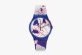 Речь идет о модели SUOZ217 из коллекции Swatch Art Peace Hotel Special. Источником вдохновения для художницы послужили комические сцены, изображенные на древнекитайских артефактах. Часы расписаны абстрактными красно-голубыми фигурами и лицами на белом фоне.