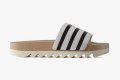 Компания adidas, производящая спортивную одежду, обувь и аксессуары, выпустила шлепанцы adilette из дерева. Как сообщает Highsnobiety, рифленая подошва выполнена из резины, а фирменный знак бренда — три вертикальные полоски — располагается на широком ремешке.