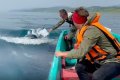 Косатки держались вблизи лодки, постоянно подныривая под нее. Одному из туристов удалось даже дотронуться до спины животного, которое подплыло вплотную к борту судна.
