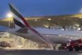 На видео видно, как несколько пожарных машин поливают дымящуюся хвостовую часть самолета авиакомпании Emirates.