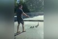 Добрый поступок водителя попал на видео. На кадрах видно, как мужчина выходит из машины и подходит к утиному семейству. Затем он осторожно подгоняет птиц к тротуару, проследив, чтобы их никто не сбил.