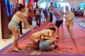 В следующем кадре видно, как мужчина и охранник казино разнимают вновь завязавшуюся драку между женщинами. Когда посетительниц наконец растаскивают, охранник прижимает женщину в нижнем белье к полу и заводит ее руки за спину.